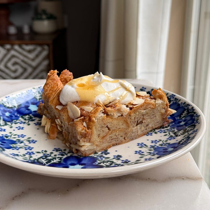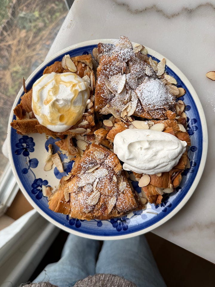 Hello hello! Today I have for you the first sub exclusive recipe of the year and it’s a little bit of an easy (but super delicious) one. Like the earl grey croissants I posted last week, these start out with store-bought croissants because there’s really no reason to make your own, especially when we’re just drowning them in a delish and rich custard. The custard in question is flavored with vanilla, honey, and cinnamon, and has some added crunch from some sliced almonds. It’s super delish, easy to make, finished off with a honey vanilla whipped cream, and it’s not too heavy because we’re using a ton of lighter flavors.