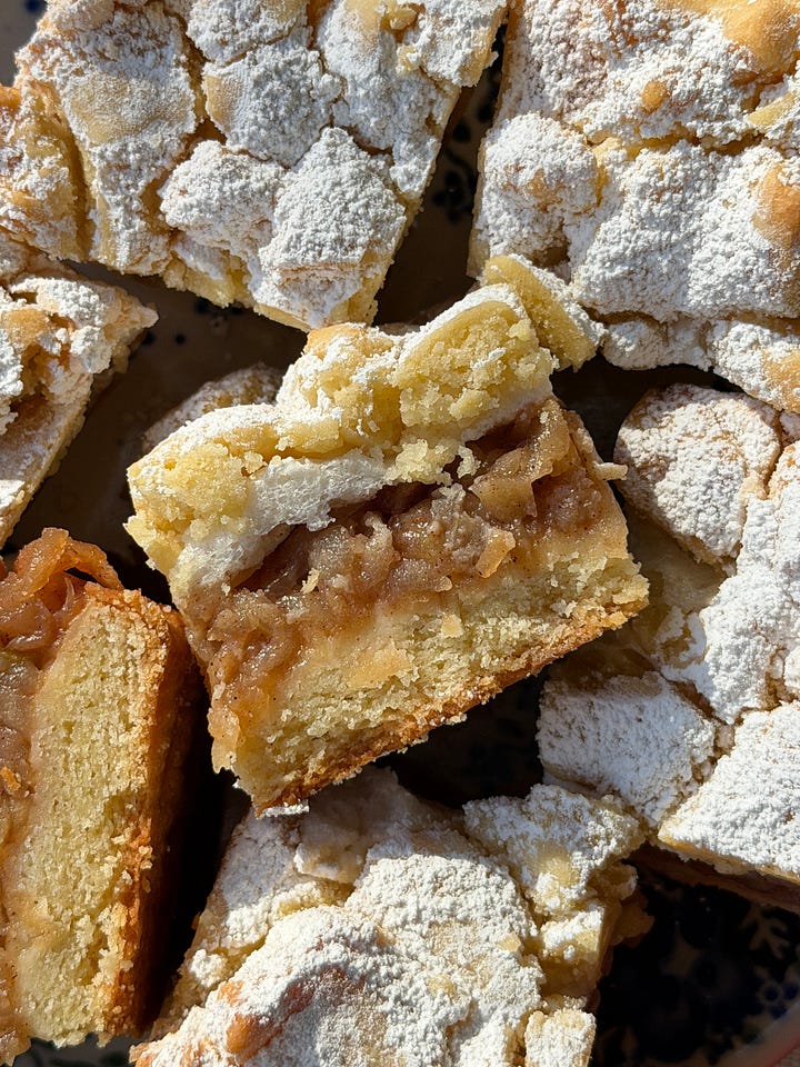 This is szarlotka (shar-lot-ka), or polish apple cake, which is more akin to an apple pie bar than a cake. It starts out with a sweet shortcrust pastry (or a pâte sucrée, if you want to make it sound fancier) that gets topped with a thick layer of lightly sweetened cooked shredded apples. Sometimes it’s topped with meringue, sometimes not, but I decided to top the apples with meringue because 1) it’s delicious and 2) we have an extra egg white to use up from the crust anyway — but you could certainly skip the meringue if you’re in a time crunch! The whole thing is topped off with crumbled sweet shortcrust pastry and a generous dusting of powdered sugar, which is where the majority of the sweetness comes from.